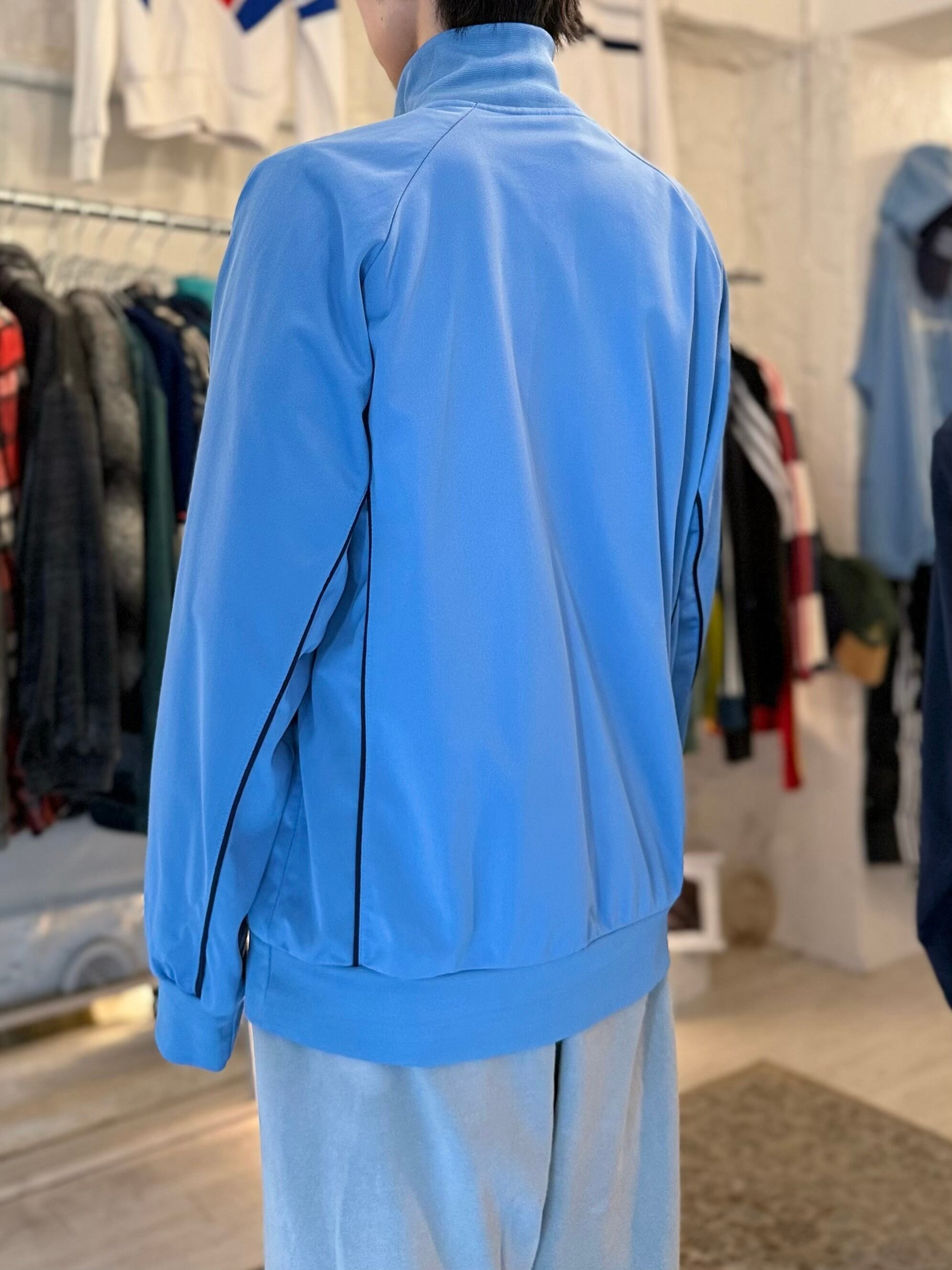 水色一色のアンブロトラックジャケット。単色なのでコーデのアクセントとして差し色に使うのもgoodです。サイズ感としては大きめなので、襟や袖からチラッと水色を見せるのも良いと思います。