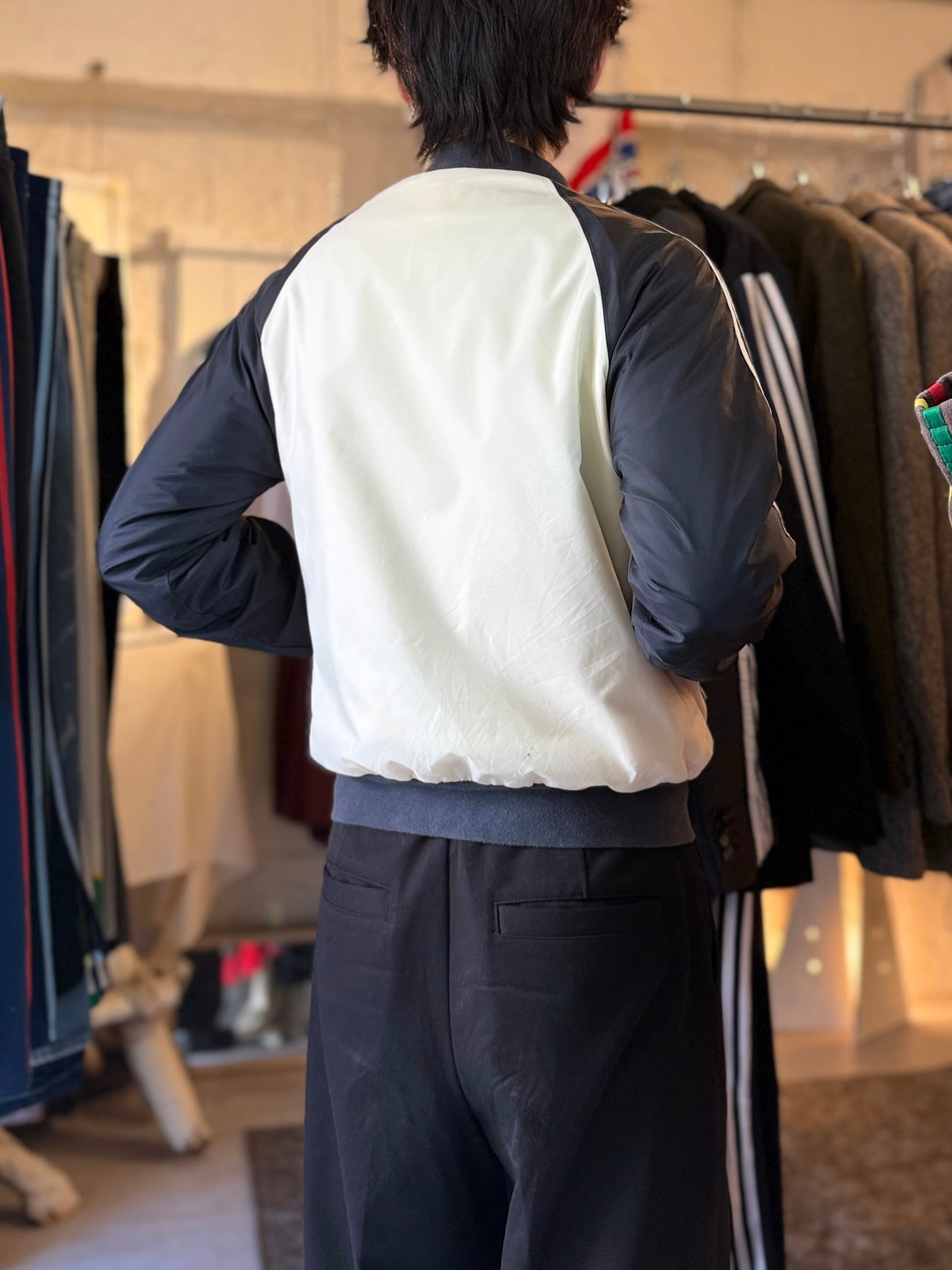 胸元の大きなロゴが目を引くトラックジャケット。ロゴは派手ながらも、配色はシンプルで、白と黒のモノトーンなので色々なコーデに合わせやすく万能な一着です